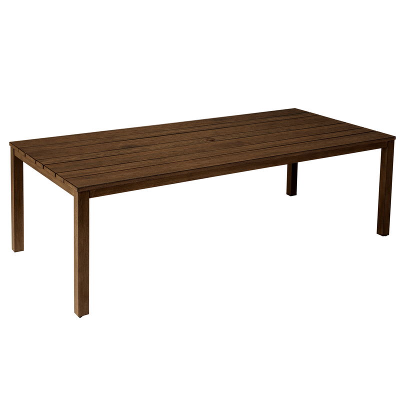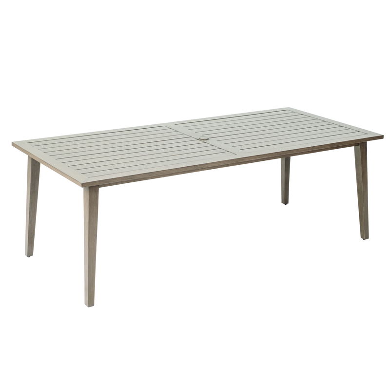 - Brighton 94.5" Rectangular Wood Grain Random Width Alum Slat Dining Table w/ umbrella hole